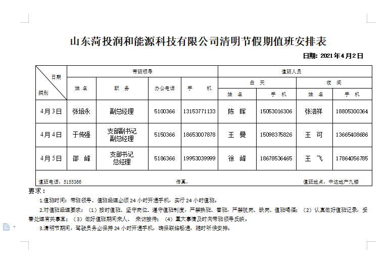 山東菏投潤(rùn)和能源科技有限公司清明節(jié)值班表