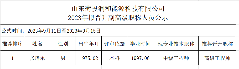 山東菏投潤和能源科技有限公司2023年擬晉升副高級職稱人員公示